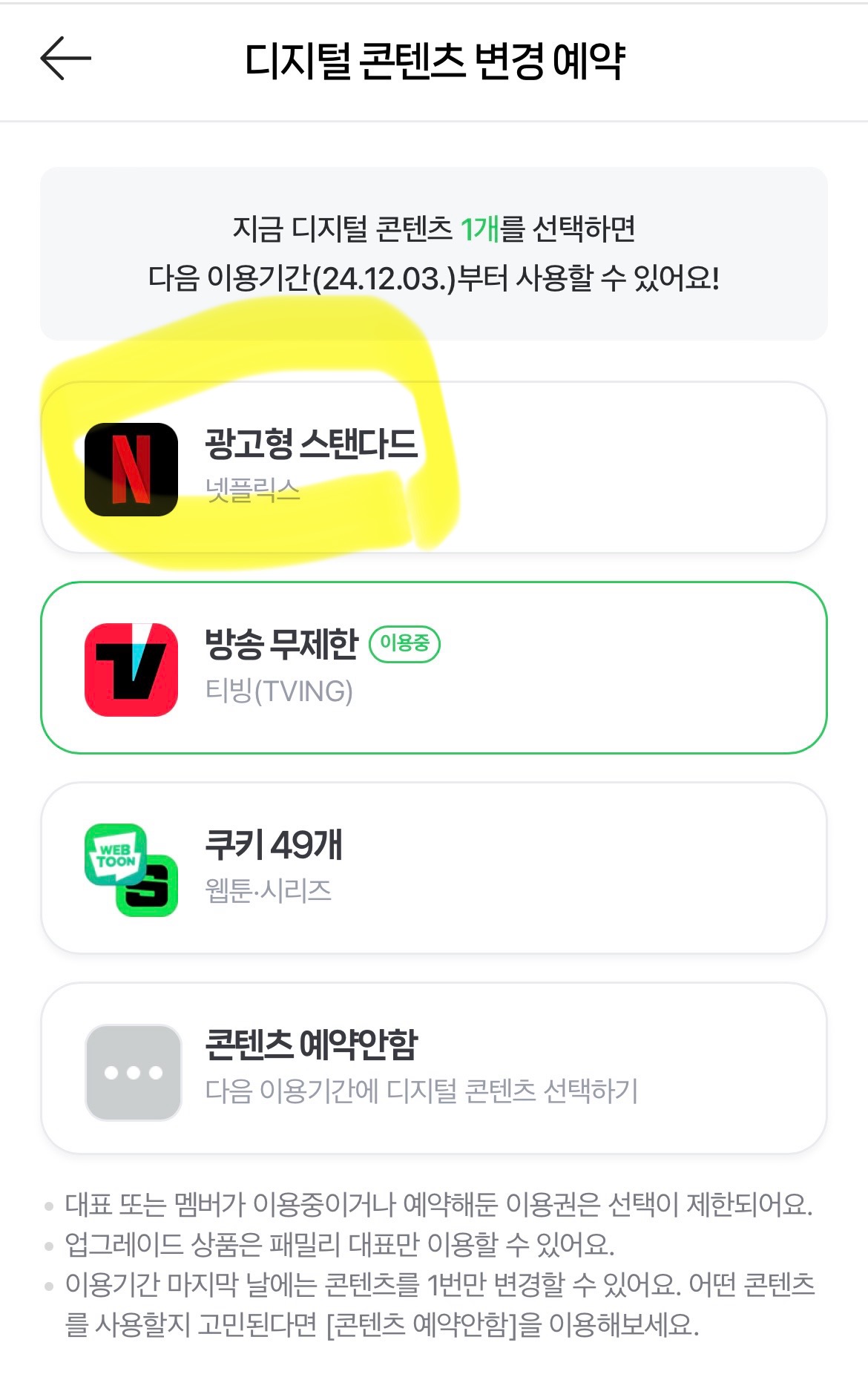 여기서 하단 다음 달 콘텐츠 변경예약 누르고