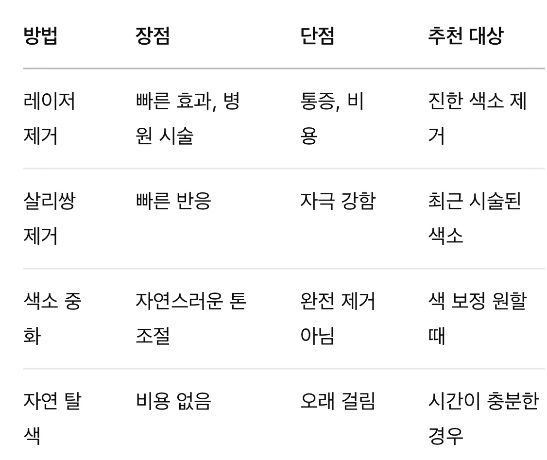A: 집에서 자연 탈색을 기다리는 것 외에는 효과적인 방법이 없습니다. 강한 약품이나 DIY 제거는 위험하니 피하세요.