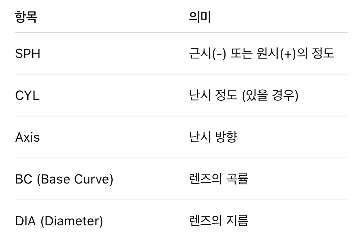 렌즈를 구매할 때는 반드시 렌즈 전용 처방전(Prescription)을 받아야 합니다. 처방전에는 다음과 같은 정보가 포함됩니다.