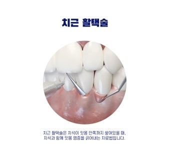 - 전문 치과 기구(큐렛, 초음파 스케일러 등)를 이용하여 치아 뿌리 표면에 부착된 세균과 치석 제거